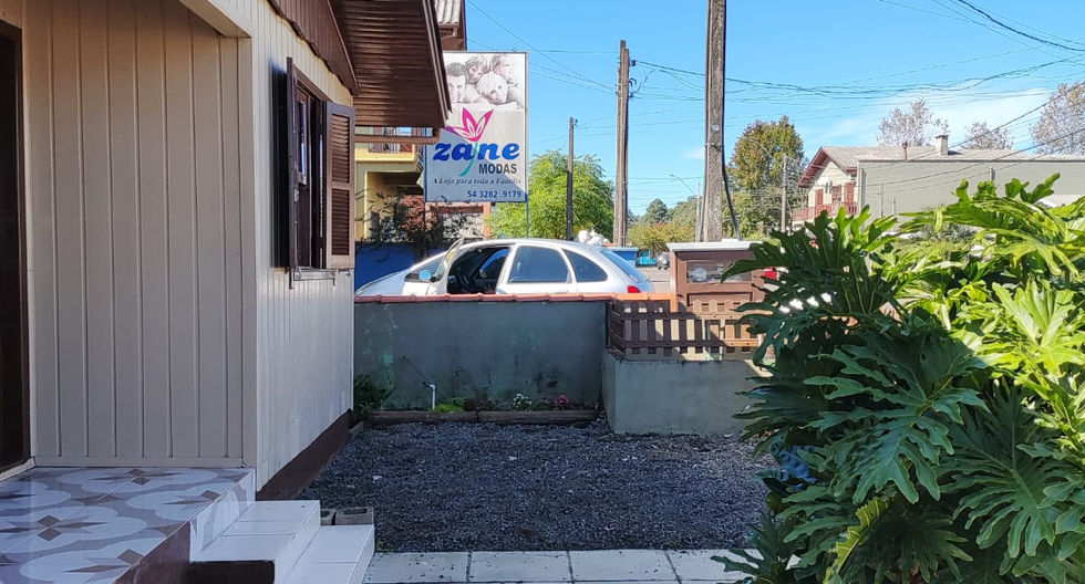 Residência em madeira com uma edícula em alvenaria ao fundo.